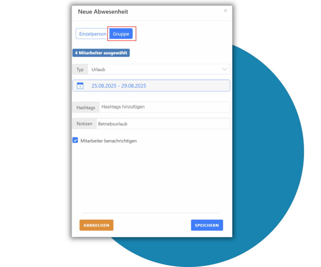 Mit nur einem Eintrag werden die Abwesenheiten automatisch allen ausgewählten Mitarbeiter zugeordnet. So sparen Sie wertvolle Zeit, vermeiden doppelte Eingaben und stellen sicher, dass Abwesenheiten einheitlich dokumentiert sind.