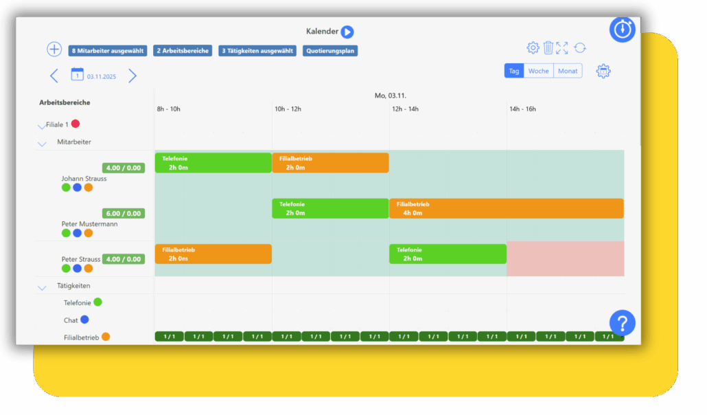 Das Unternehmen suchte daher nach einer integrierten Lösung, um Filial- und Callcenter-Teams besser miteinander zu verbinden. Ziel war es, Leerzeiten zu reduzieren, die Erreichbarkeit für Kunden zu verbessern und eine automatische, faire sowie flexible Personaleinsatzplanung zu schaffen. Dabei sollten individuelle Verfügbarkeiten, Qualifikationen und Tätigkeitsbereiche der Mitarbeitenden berücksichtigt werden, um die Personaleinsätze optimal zu steuern und den Betrieb effizienter zu gestalten.
