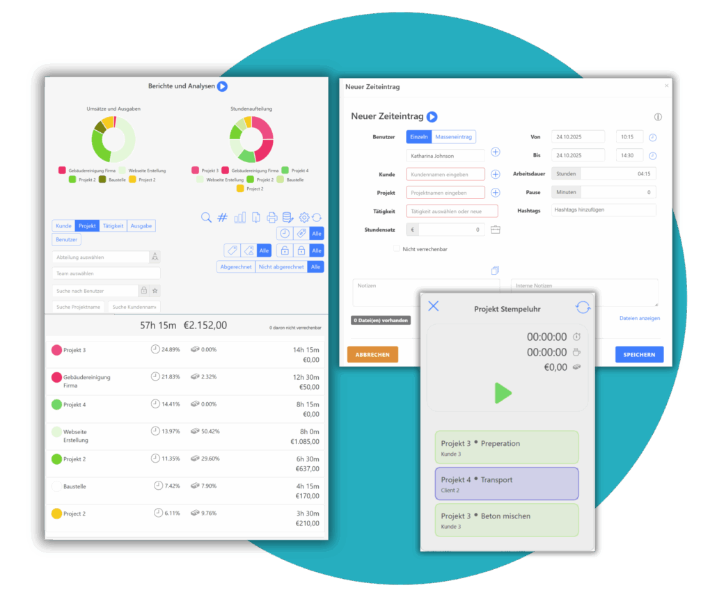 Das Unternehmen benötigte ein Zeiterfassungssystem, das sowohl Flexibilität im Alltag als auch strukturierte Kontrolle bietet.Mitarbeitende sollten ihre Projektzeiten auf verschiedene Arten erfassen können, ob klassisch per Stempeluhr, manuell oder nachträglich, abhängig von Arbeitsort und Projektstruktur.