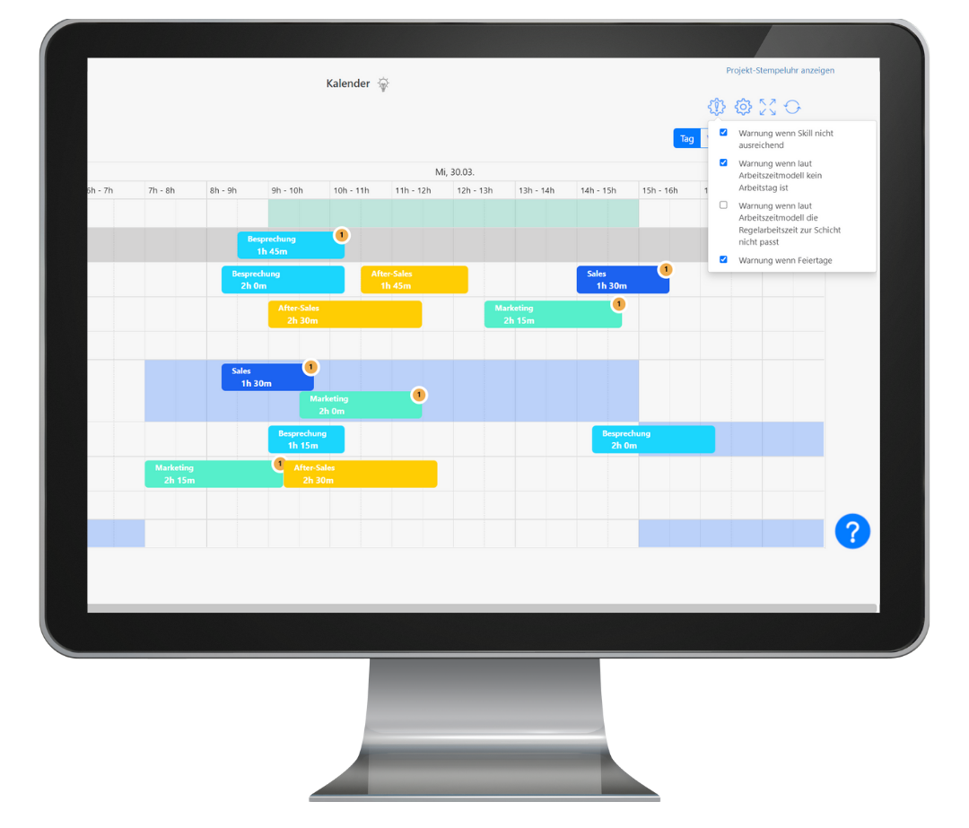 TimeTrack hilft Ihnen, Ihre Planung fehlerfrei zu halten. Wenn Sie eine Aufgabe einem unqualifizierten oder abwesenden Mitarbeiter zuweisen, erhalten Sie automatisch eine Warnung. Diese Warnungen können bei Bedarf auch einschränken.
