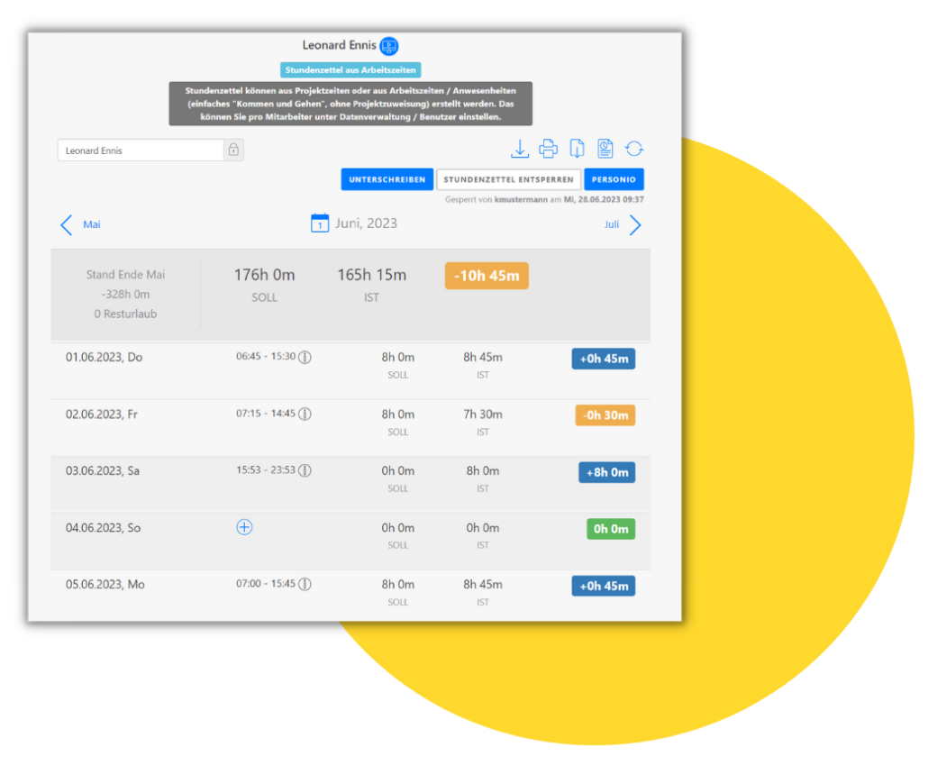 Aus den erfassten Arbeitszeiten werden automatisch Stundenzettel für alle Mitarbeiter erstellt. Dabei werden die genauen Arbeitsstunden, Pausen und Überstunden erfasst und auf gesetzliche Vorgaben geprüft.