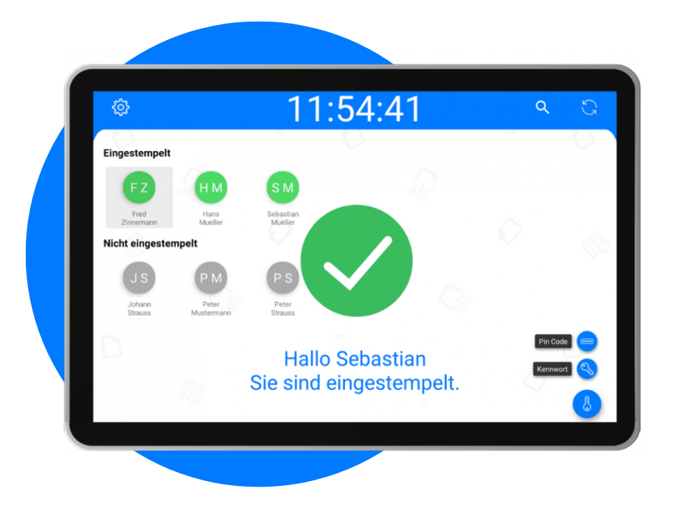 Die Ärzte und Angestellten können sich ganz einfach mit einem Pin-Code oder Chip einstempeln, wenn sie die Arztpraxis betreten. Somit wird die Arbeitszeit mit einem Klick erfasst. Die Arbeitszeit wird verrechnet, sobald sich die Person wieder ausstempelt und automatisch in den Stundenzettel eingetragen.