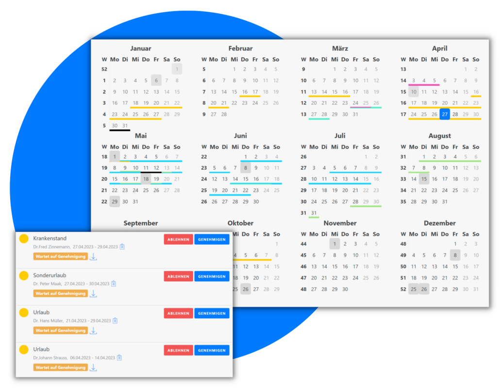 Mit TimeTrack können die Mitarbeiter ihre gewünschten Urlaubstage ganz einfach eintragen. Der Admin kann die Anfragen genehmigen oder ablehnen – je nachdem, wie der Praxisalltag im gewünschten Zeitraum aussieht.