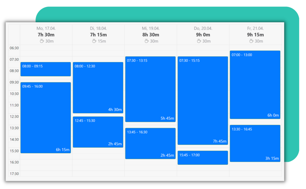 Unsere TimeTrack-Software bietet eine gesetzeskonforme Erfassung von Arbeitszeiten, Überstunden und Pausen. Sie ermöglicht es, individuelle Arbeitszeitmodelle für jeden Mitarbeiter zu definieren und anzupassen. Darüber hinaus gewährleistet die Software die Einhaltung unserer Datenschutzbestimmungen bei der Speicherung sämtlicher Daten.