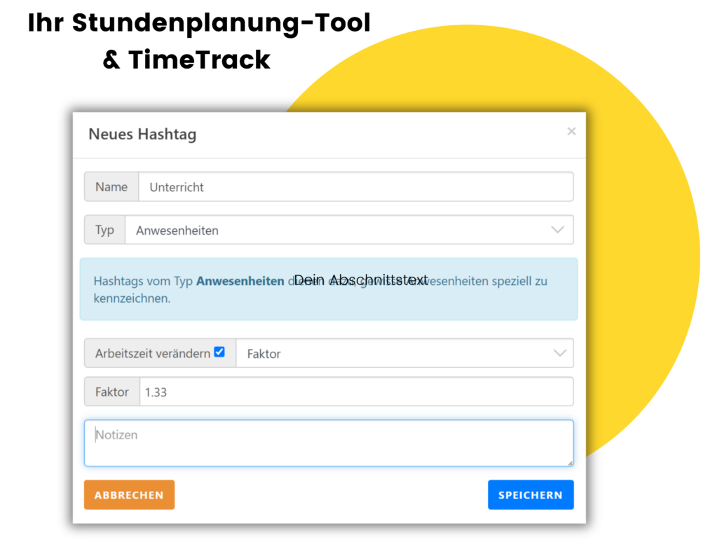 TimeTrack ermöglicht, Ihre Stundenpläne aus verschiedenen Tools zu importieren und automatisch in Zeiteinträge zu verwandeln. Daraus wird ein Stundenzettel generiert, der Unterrichtsstunden von 45 Minuten als volle Arbeitsstunde von 60 Minuten erfasst, wie es gesetzlich vorgesehen ist. Die Faktoren können flexibel definiert werden, je nachdem, ob es sich um regulären Unterricht, Begleitung, Aushilfe oder andere Tätigkeiten handelt. Mit TimeTrack erleichtern Sie die Abrechnung und Organisation in Ihrer Schule! Die Software erfüllt alle branchenspezifischen Anforderungen.