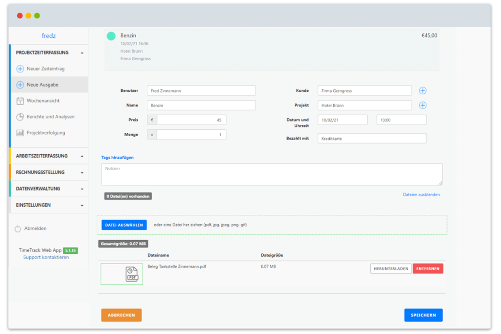 Oftmals fallen zusätzliche Ausgaben bei Projekten an. Kilometergeld und Spesen sind schnell im Zeiterfassungssystem vermerkt, sodass sie dem Kunden frühestmöglich verrechnet werden können. So geht’s: Ausgabeart wählen, Preis eingeben und Projekt angeben. Fotos von Rechnungen können einfach hinzugefügt werden. Und schon sind Sie fertig! Alle eingetragenen Daten sind unmittelbar unter Ansicht verfügbar. So behalten Sie den perfekten Überblick über Ihre Projektausgaben und Reisekosten.