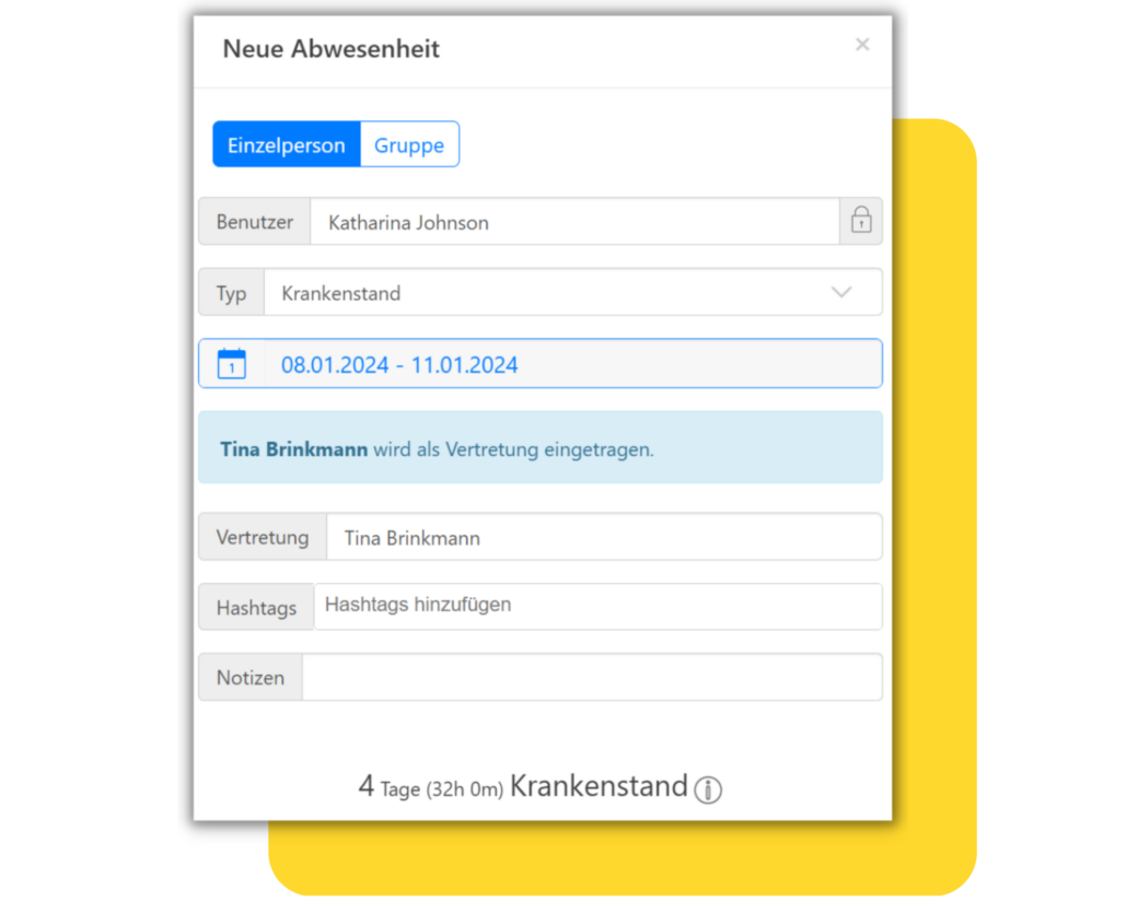 Mit TimeTrack können Ihre Mitarbeiter während ihrer Krankheits- oder Abwesenheitszeiten eine Vertretung benennen. Dies bietet den Vorteil, dass andere Abteilungen, Teams oder Kollegen stets darüber informiert sind, wer die Aufgaben des abwesenden Mitarbeiters übernimmt und somit als neue Ansprechperson fungiert. Mitarbeiter, die als Vertretung eingetragen sind, erhalten eine Benachrichtigung per E-Mail und haben die Möglichkeit, die Vertretungsanfrage anzunehmen oder abzulehnen.