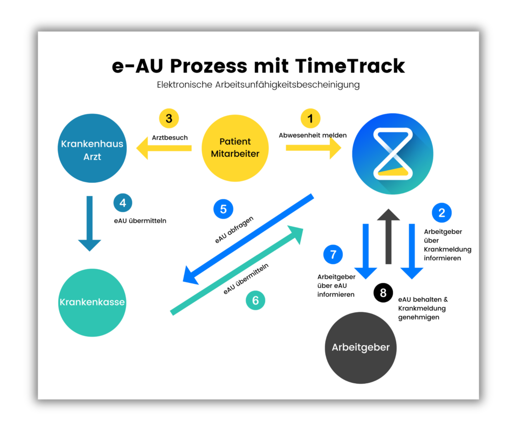 Seit dem 1. Januar 2023 wurde in Deutschland der traditionelle „gelbe Schein“ durch die elektronische AU Bescheinigung ersetzt. Diese Neuerung bedeutet, dass alle Krankheitsdaten von Arztpraxen nun digital an die Krankenversicherungen übermittelt werden. Die krankversicherten Arbeitgeber müssen diese Informationen eigenständig bei der Krankenkasse abrufen. Jedoch ermöglicht TimeTrack eine vereinfachte digitalisierte und vollautomatisierte Lösung, indem die Software selbst die relevanten Daten von der Krankenversicherung bezieht (siehe die Illustration).