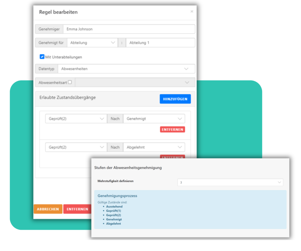 Alle Prüfer und Genehmiger werden automatisch über eingehende Abwesenheitsanträge benachrichtigt. Diese mehrstufige Struktur sorgt dafür, dass wichtige Entscheidungen auf mehreren Ebenen überprüft werden, was insbesondere bei sensiblen oder unternehmenskritischen Prozessen von großer Bedeutung ist.