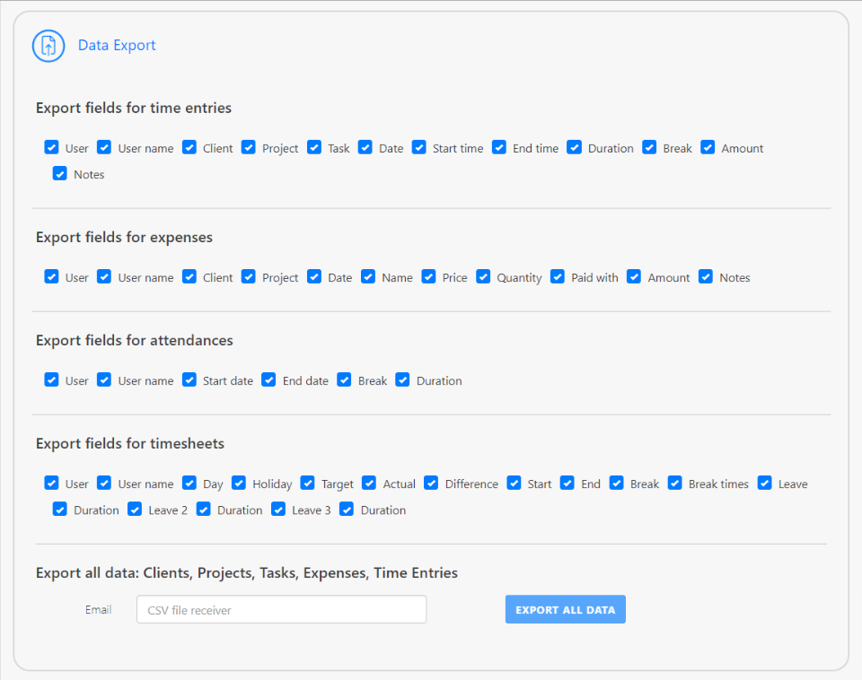First of all, you will need a TimeTrack Cloud account – create it directly in the Pro or Free App. In the Web App of the Cloud Account, go to Settings > Data Export. Here you can select and deselect export fields for time entries and expenses, if you don’t need or want to change all of them. Then enter your email address to which the CSV files will be sent.