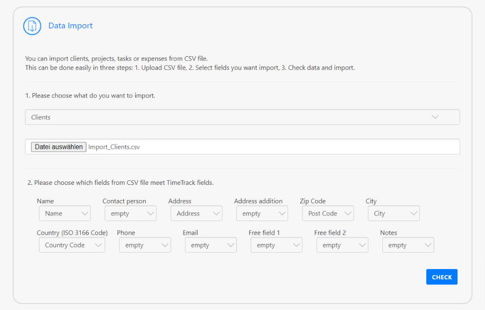 Go back to Settings and import the customers first. You can choose which data you want to import, from the dropdown menu. Then upload your file with the customer data. You can select which fields from the CSV file should correspond to the fields in TimeTrack. The headers must be present in the file.