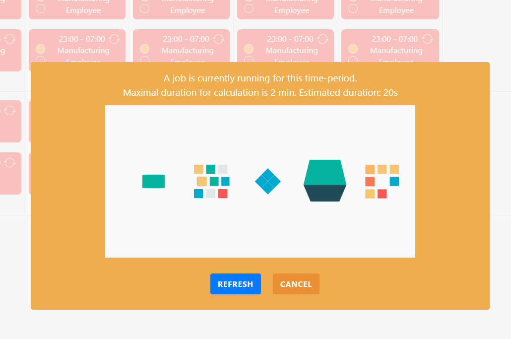 Click on “Assign” to start the automatic assignment. For the period during which this calculation is running, the editing of the duty roster will be blocked. Depending on how complex your roster is, the duration of the processing will vary. You will see an orange box indicating the approximate duration until completion. Often the duration is shorter in reality and your roster can be viewed after a few moments.