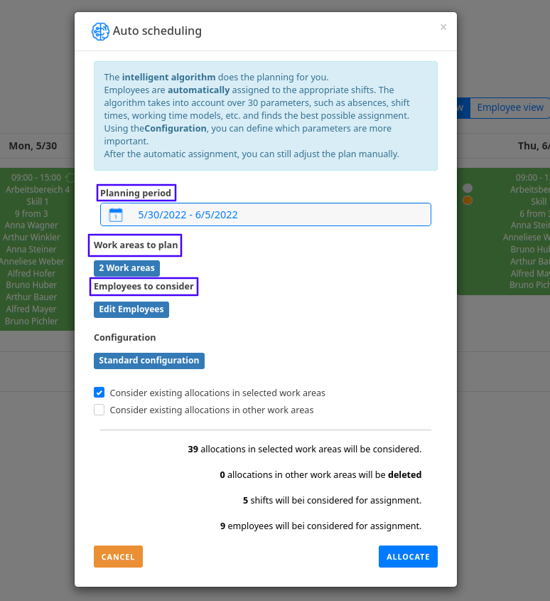 You will be returned to the previous field, where you can decide whether to consider existing allocations. If you have already manually assigned some services to employees, we suggest that you click on “Consider existing allocations”. The algorithm will then leave your allocations alone and take care only of the outstanding shifts.