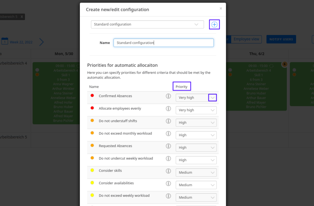 Under “Configuration” you can specify the priority of the criteria that the software should observe. Click on the drop-down menu next to a criterion to select the priority. You can choose between “Do not consider”, “Low”, “Medium”, “High” and “Very high”. Decide whether target hours should be taken into account, whether overbooking is allowed and much more.