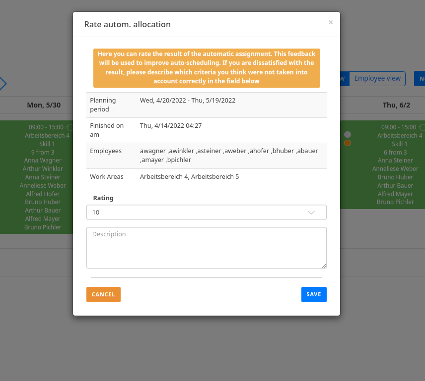 Once your automatic assignment is ready, you can give us feedback. To do so, click on “Rate Automatic Assignment“. Rate the process from 1-10, with 10 being the best result, and leave us a note. This will allow us to adjust the algorithm to your wishes and optimize it in the best possible way. Click “Save” to submit your feedback.
