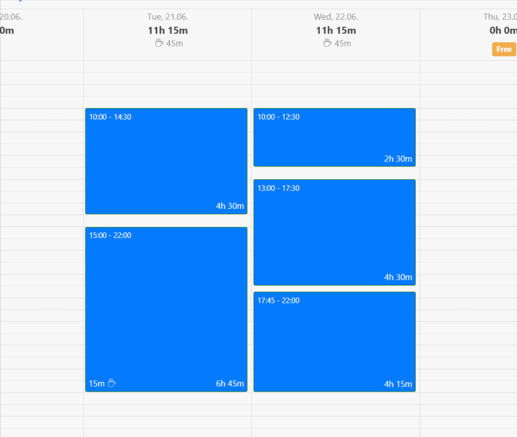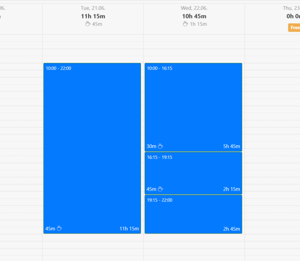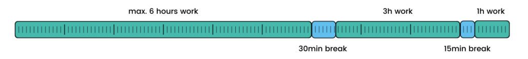 Example: Max has a work from 10:00 – 22:00; this results in 10 hours of attendance and thus a mandatory 45-minute break. He clocks out at 13:00 for only half an hour. Once Max exceeds 9 hours of work time, the system deducts an additional 15 minutes from him. In this case, that’s after 19:30. The work he does after 20:00, and the related bonuses, are not affected by the break rule.