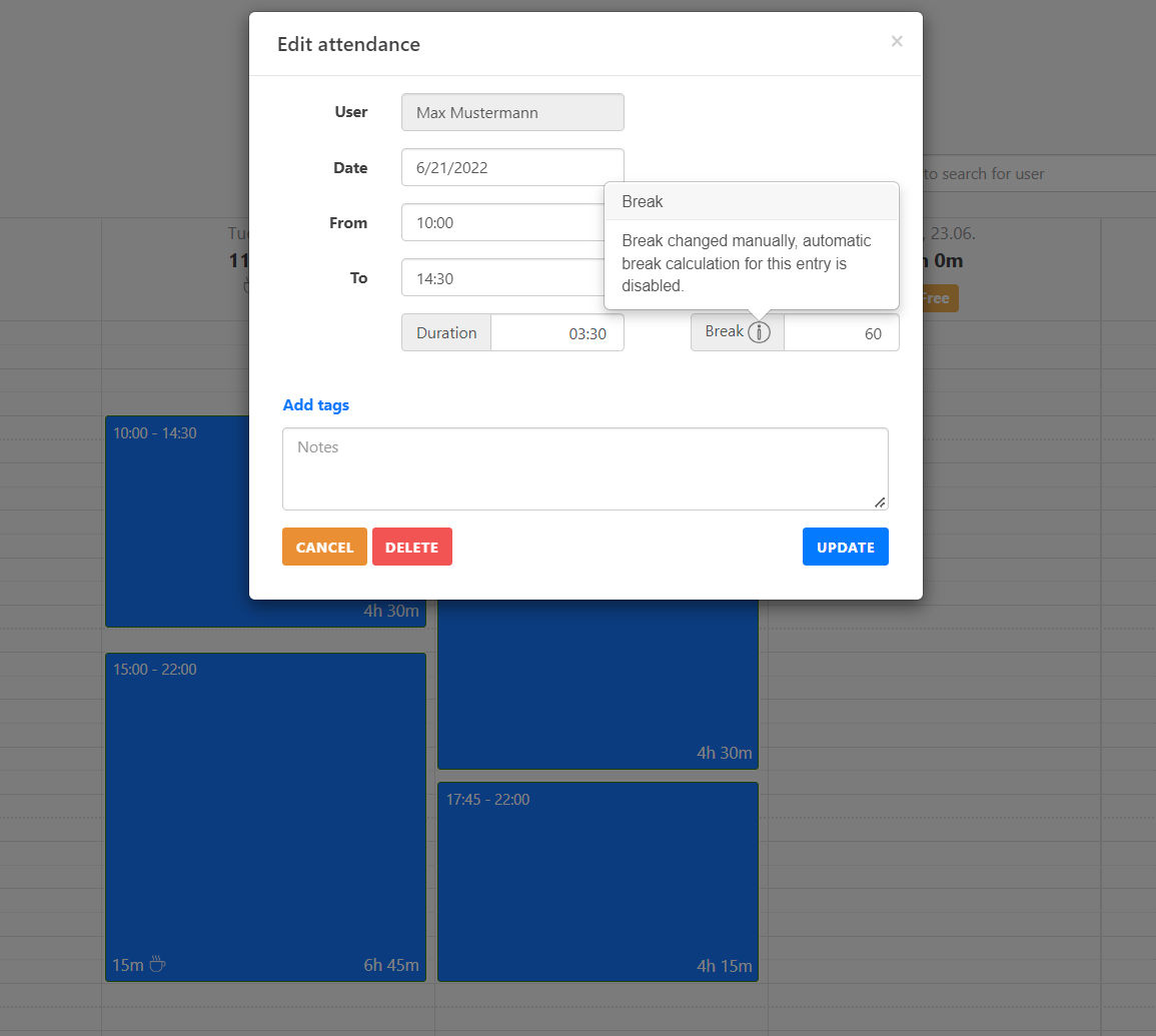 Employees can also enter their break duration in the attendance themselves. To do this, they must click on the entered attendance under Attendance tracking > Attendances. They can now edit the “Break” field themselves. A warning appears that the automatic brctieak deduon is deactivated for this entry.