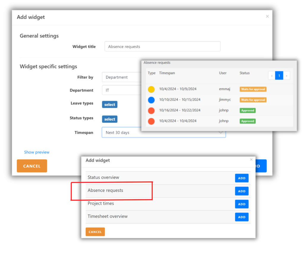In the “Absence Requests” widget, you can view all absence requests submitted by employees and approve or reject them immediately.