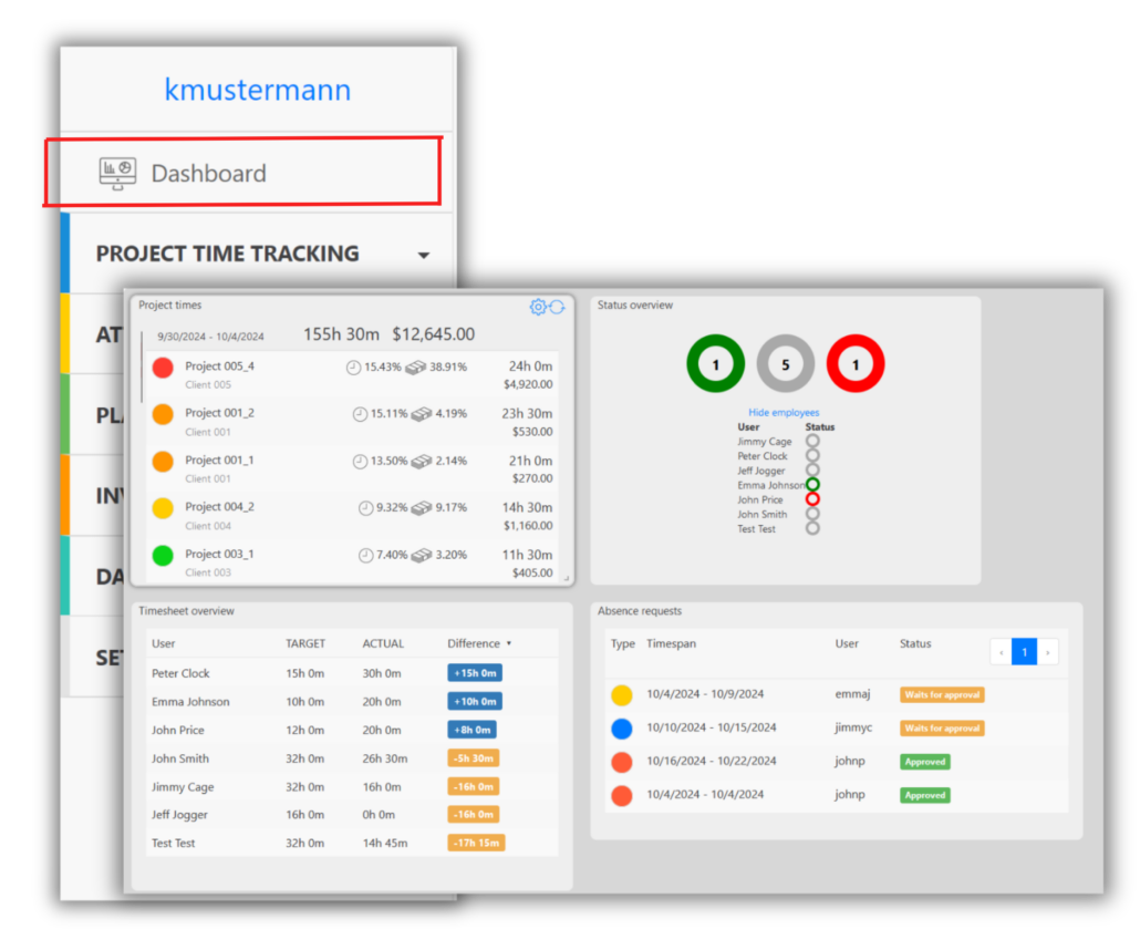 In your TimeTrack account, you can enable the dashboard. The dashboard is a tool that allows you to visualize the most important data in the system at a glance. You can add various widgets to the dashboard that display data from different modules.