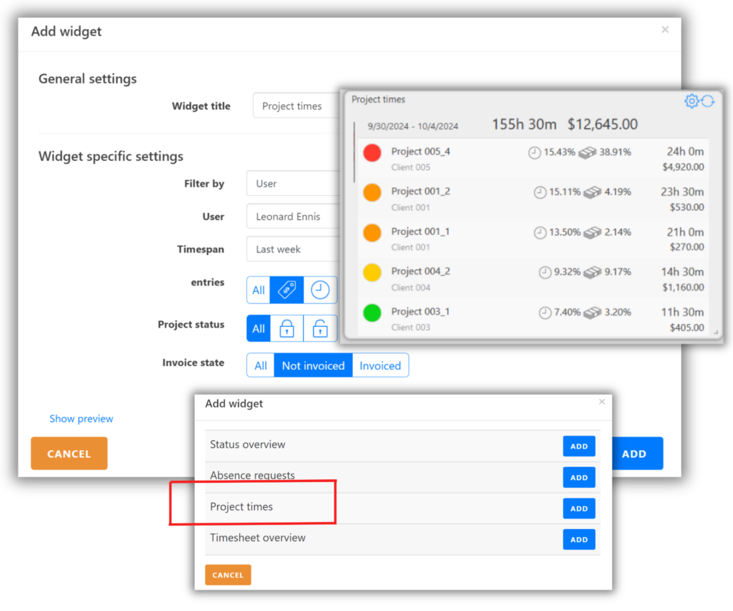 In the “Project Times” widget, you can display users’ booked project time entries.