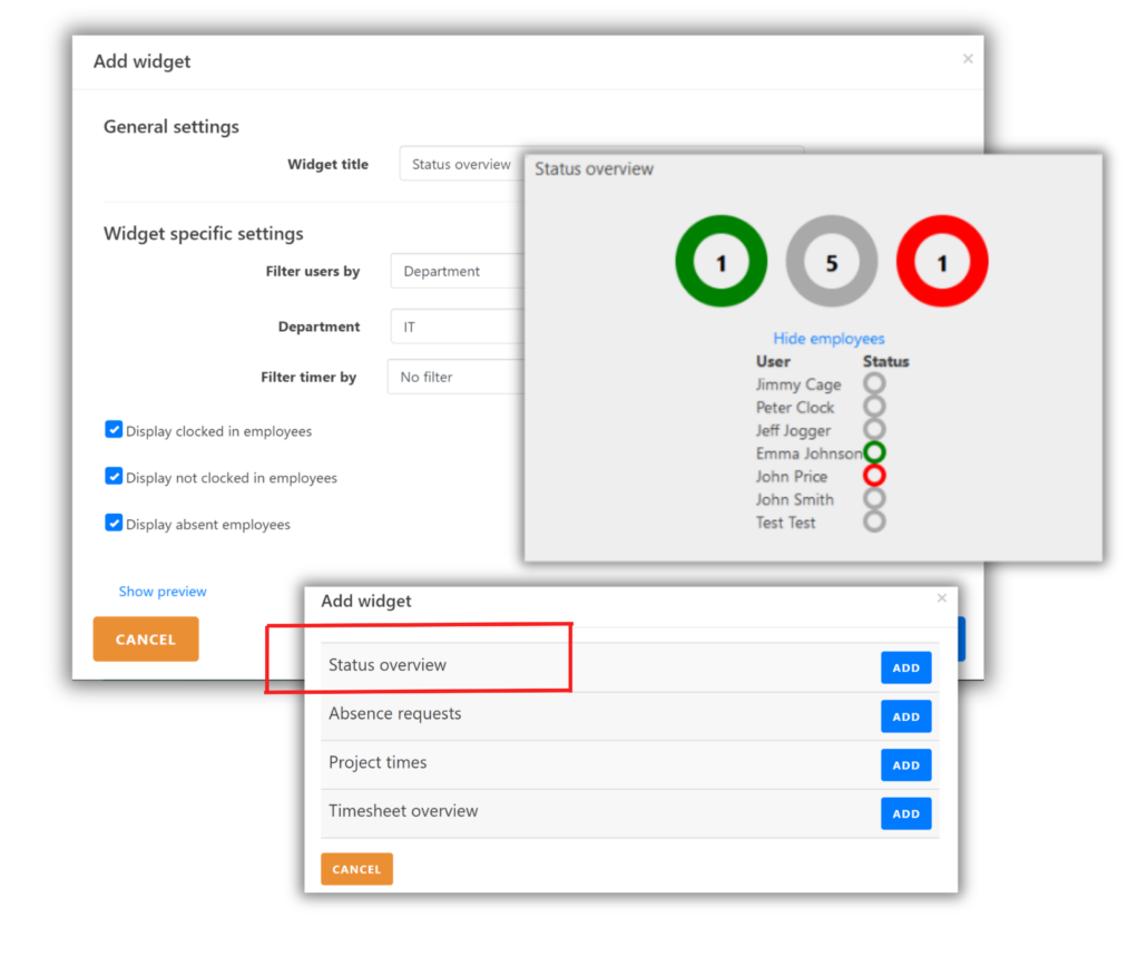 In the widget-specific settings, you can define the period, such as this week, last week, or this month, etc., and apply filters for employees. When you click “Preview,” you will see how the widget will look. Any changes you make to the widget-specific settings will be applied immediately.