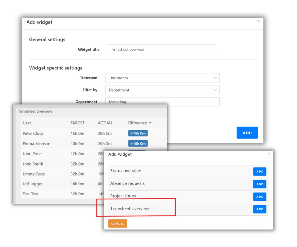 The “Timesheet Overview” widget allows you to display the target and actual hours as well as the hour differences for employees over a specific period.