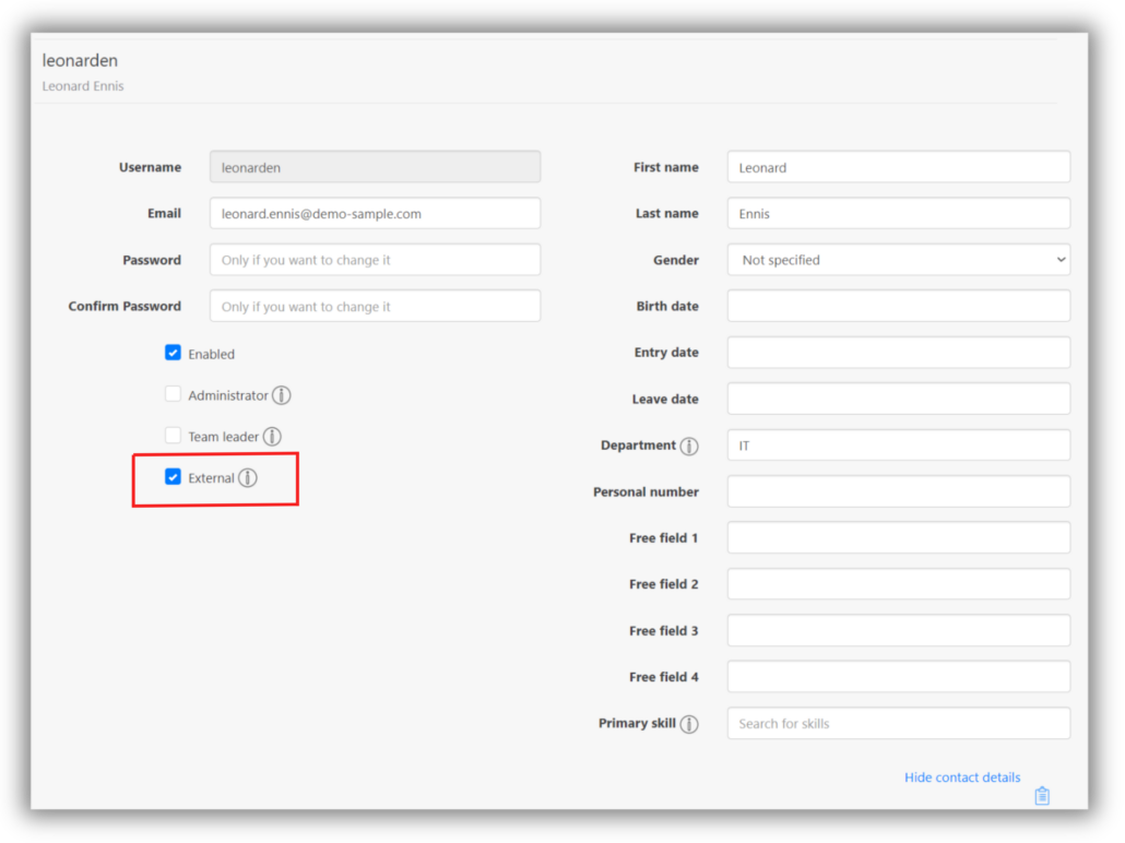 In TimeTrack, you have the option to mark a user as an “External”. This can be set in the employee’s user profile under Data Administration > Users.