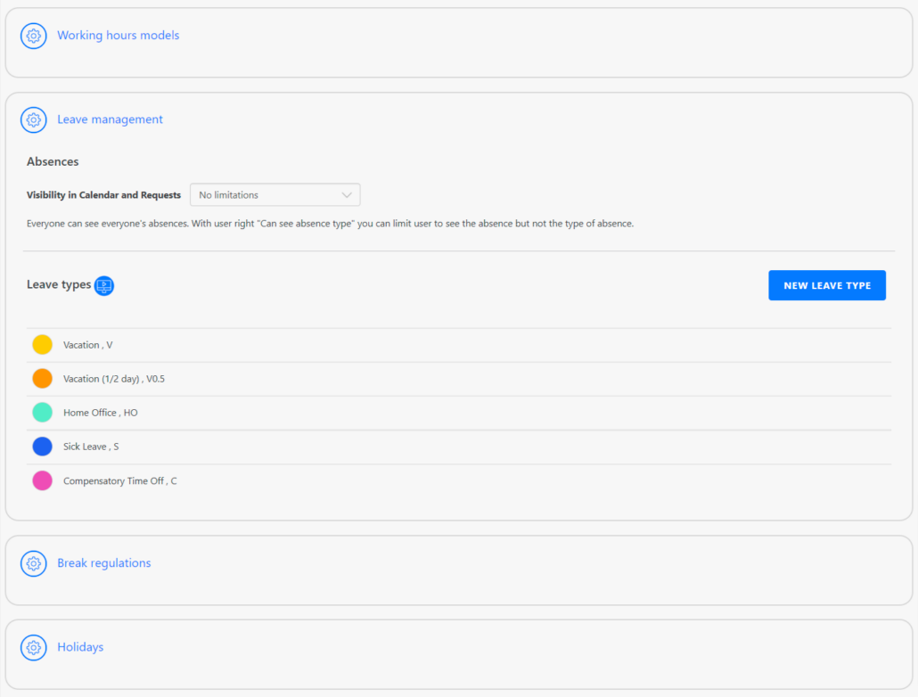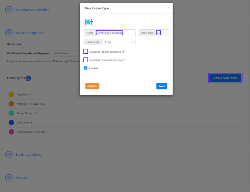 As an admin, you can manually define new leave types, such as ‘Continuing Education’. To do so, click on ‘New Leave Type’. First choose a color so that you can find your way around better later in the paid leave report. Then enter the name of the absence and the short code.