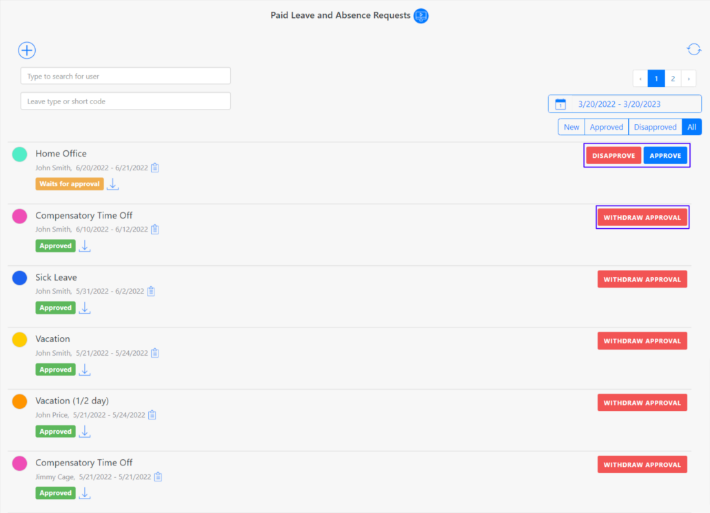 Each absence must be approved or disapproved by the admin. To do so, click on ‘Approve’ or ‘Disapprove’. You can also withdraw your approval if it was an error. If an absence is approved, the paid leave report will be updated automatically.
