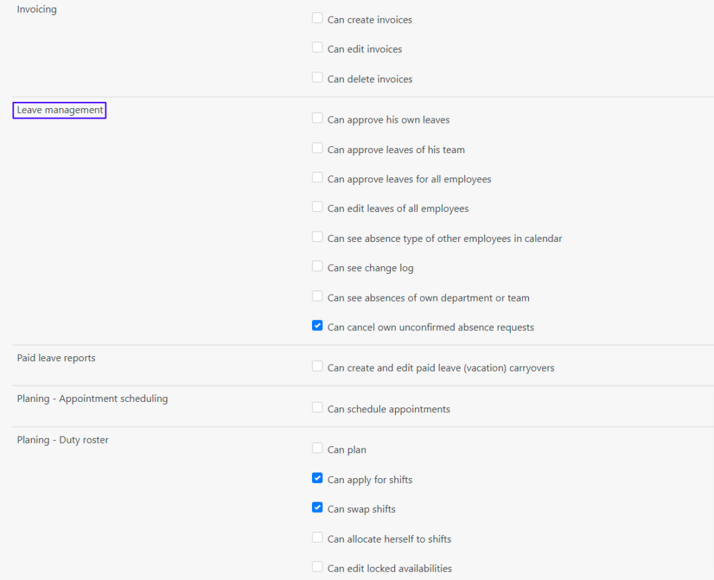 Normally, every employee can see the absences of other employees. However, under Data management > Users you can determine the user rights. With the permission ‘Can see absence type‘ you can prevent someone from seeing the type of absence.
