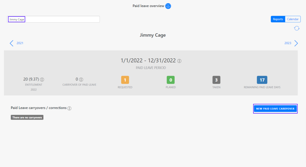 In the paid leave report you can view the leave entitlement for the current year, the carryover of the leave days from the previous year and the planned, used and open leave days. To do this, first select an employee in the upper left search bar. The vacation entitlement is automatically calculated from the employee’s working hours model. To carry over vacation days to the next year, create a new paid leave carryover. To do this, you just need to specify the number of days and click on Save.