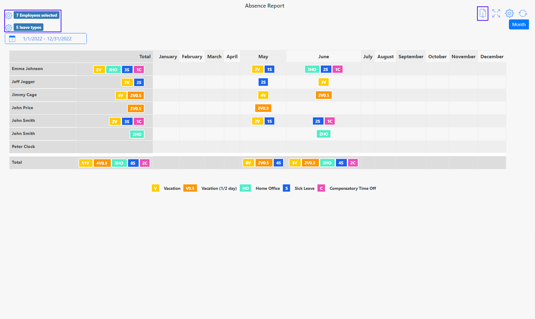 From the menu, go to Attendance Tracking > Reporting > Absence Report to view a report specific to the absences. You can filter by employees and leave types, as well as select a time period. All absences are displayed as short codes and by employee. The absence report can be downloaded in both CSV and Excel formats.