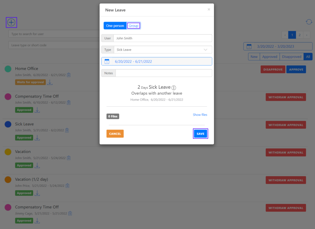 A new absence can be requested by clicking on the plus icon in the upper left corner. Absences can be requested both for individuals and for groups. For both options it is necessary to specify the names of the users, the absence type and the time period. Optionally, one can add notes and files. In case of a group absence request, you can also choose whether the employees should be notified or not. The requests for group absences are approved automatically. Click on ‘Save’ when you have entered all the necessary information.