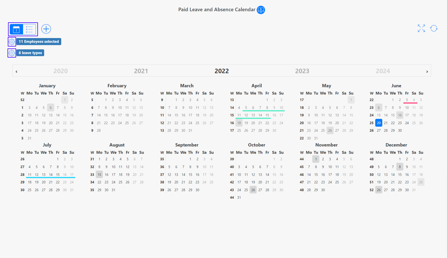 You can get a clear overview of absences under Attendance Tracking > Leave/Absence > Calendar. In addition to a calendar view, you can also work with a list view. To do so, click on the corresponding icon in the upper left corner. Select the employees and absence types by clicking on the corresponding settings icon. All absences will be displayed in the assigned color in the absence calendar.