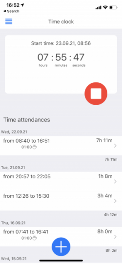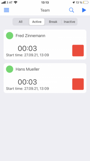 Open the Time Clock in the App, tap Start, and the time clock will start running. If you are on the road with your team as a team leader, you can clock in yourself and your employees via Team. For example, employees can clock in with you and under the option Active you can see who is already working and who may not be there yet. The same applies at the end of the work day when your employees want to clock out.