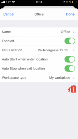 You can also deactivate the workspace by tapping on the name of the space and cancel the activation. You can delete the work location by tapping on the rubbish bin in the bottom right corner.