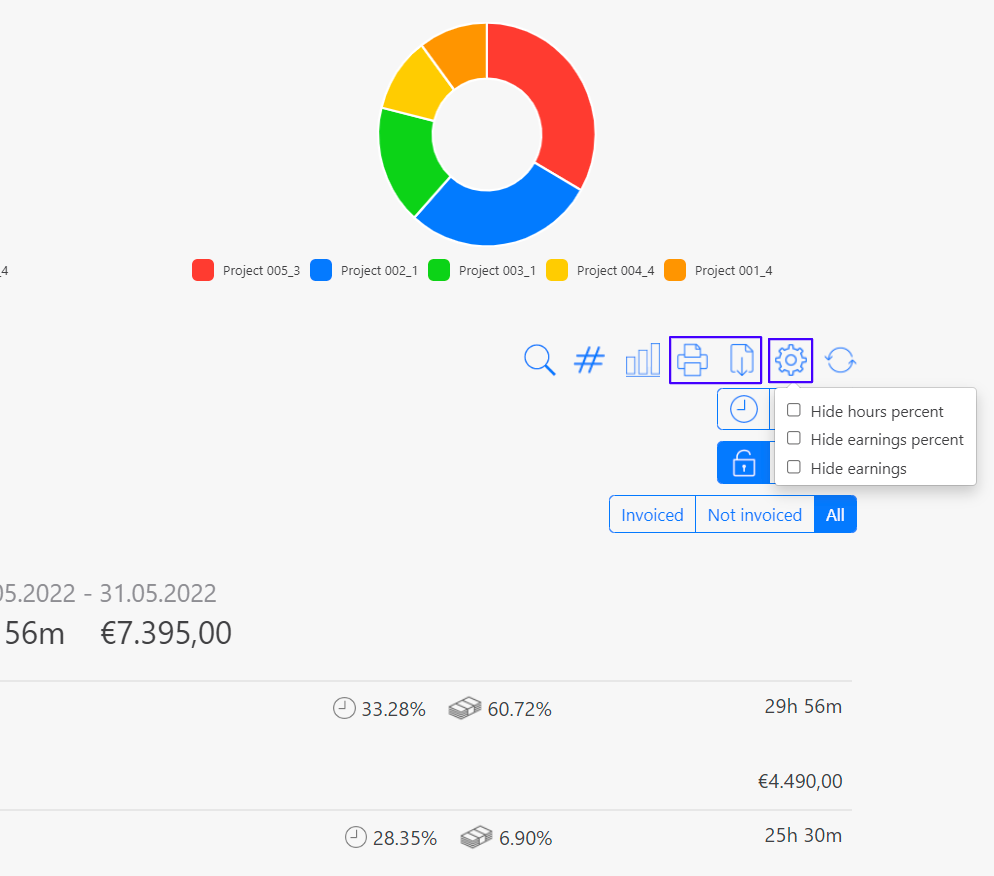 If you want less accurate reports, you can hide the percentages for the hours and earnings or the earnings themselves using the settings icon. When you have made all your entries, the reports and analyses can be printed, saved as PDF or CSV.