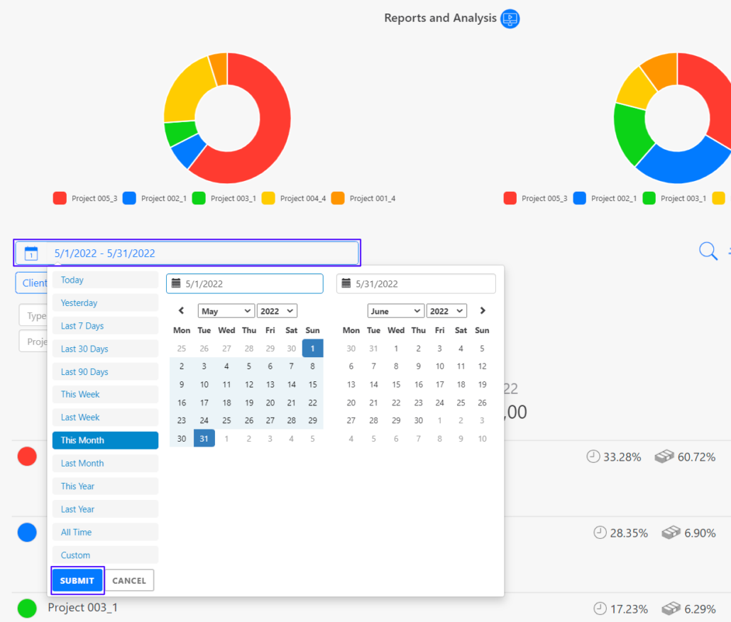 To benefit from the automatically generated reports and analysis of TimeTracks Project Controlling, you must first define the period for which you want to view them. Click on “Submit” to save your settings.