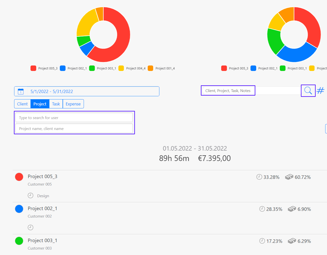 If you want to view only certain information, you can use one of the numerous filter options. To view only customers, projects, activities or expenses, click on the respective field. If you have set the “Projects” filter, the projects below it will be sorted by the most performed task.