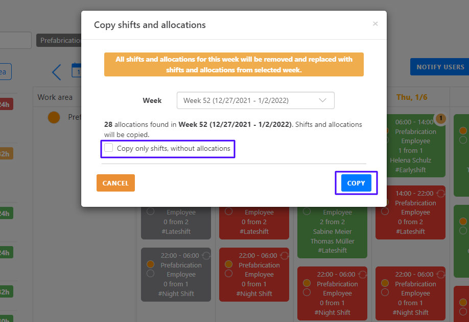 Important: When copying shifts and assignments, both the shifts and the scheduled employees will be copied. If you copy only the shifts, only the shifts will be carried over to the next week’s shift schedule, without the scheduled employees. Now you would need to assign new employees to the shifts.