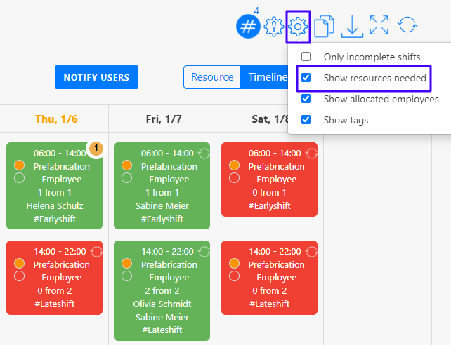In the top right corner of the calendar view you will find some settings. Click on the settings icon and select what exactly you want to display in the shift. If you select “Show resources needed“, you will see how many employees you need for the shift. You can also view the tags that are stored in the shift for example.