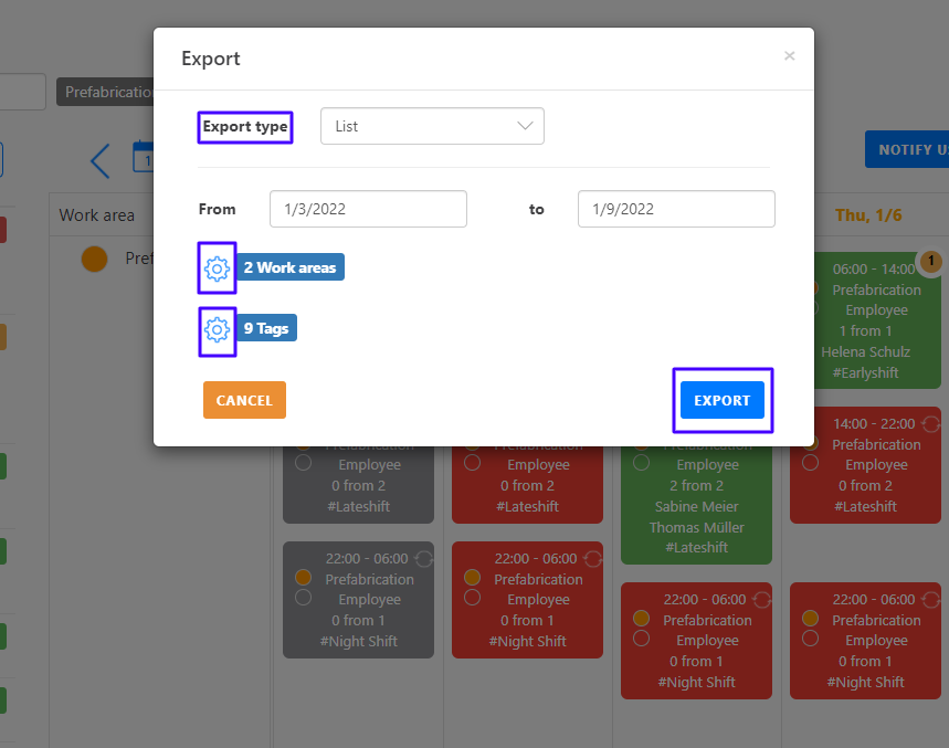 You can also easily export the duty roster. For this we offer three different export types: List, Calendar and Resource. In order to export, click on the download button in the upper right corner and select which shifts from which days you want to export. You can set filters if you are interested in specific workspaces or tags by clicking the settings icon.