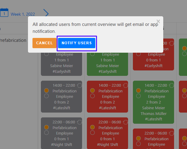 When you have fully assigned your shifts, click on “Notify users“. Now all assigned employees will receive an email with your duty roster. If you make any changes, just hit the button again.