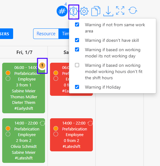 Some employees may have an icon next to their name. These are warnings. In the upper right corner, you can click on the exclamation mark to select which warnings you do not want to see when scheduling.