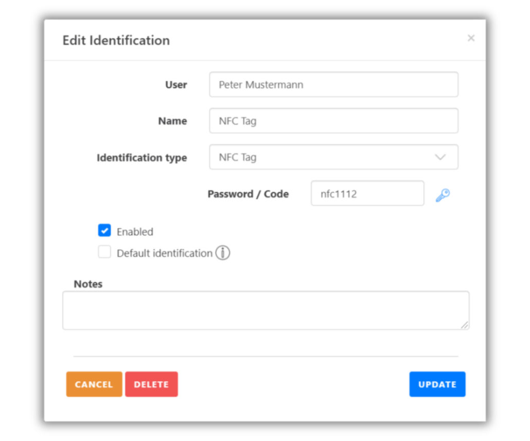 If you have selected the identification type NFC tag, enter the content of the NFC tag here (look at the next screenshot). You can read the contents of an NFC tag with an NFC app. Search for NFC tools in the App Store or Play Store. The NFC app will be able to read the NFC tag so that you can enter its content under “Password / Code”. You can also generate a code by clicking on the key icon and save this code on your NFC tag (for this you will also need the help of the NFC app)