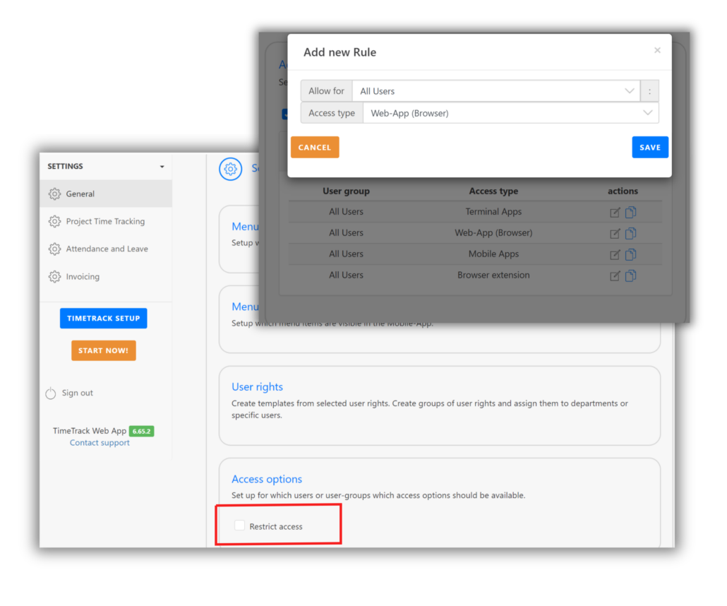 In TimeTrack, you can manage user access and restrict access types for specific user groups. Go to the Settings > General > Setup > Access options.
