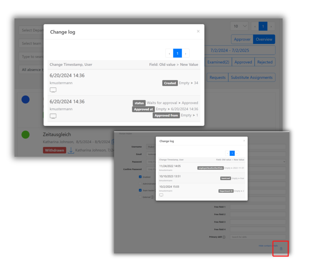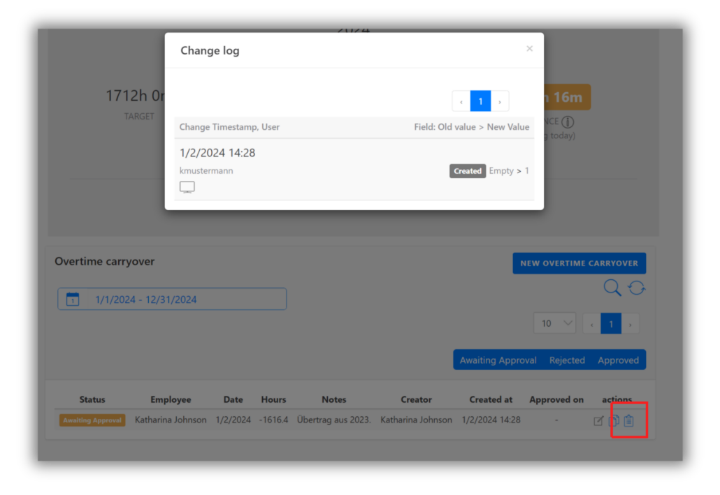 In TimeTrack, you can also access the change log in other areas of the software. This is done via the same clipboard icon. A change log is available for time corrections, assigned overtime, absence requests, and user profiles.