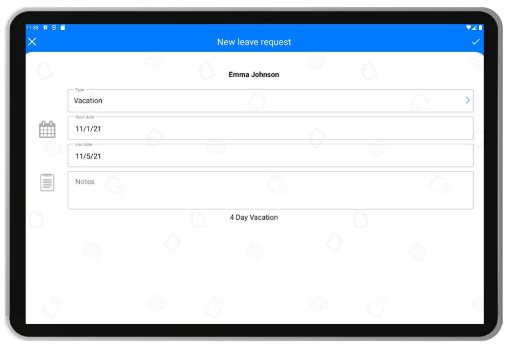 Any absence can be requested directly on the tablet. After defining the Time Period and Type of Absence, the authorized User needs to approve the absence. The Request is sent directly to the responsible employee. As soon as the leave is approved, the Absence is recorded and saved in both the Web App and the User Account in the Terminal App. Simple and fast – exactly how an absence request should be.