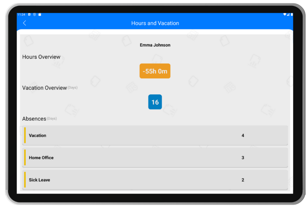 In the terminal app, you can easily select an employee to access the Hours or Leave Overview. This means that you do not have to log in to the web app to view recorded Minus hours or Overtime. The selected employee’s open Holiday Entitlement and Absence list will also be displayed.