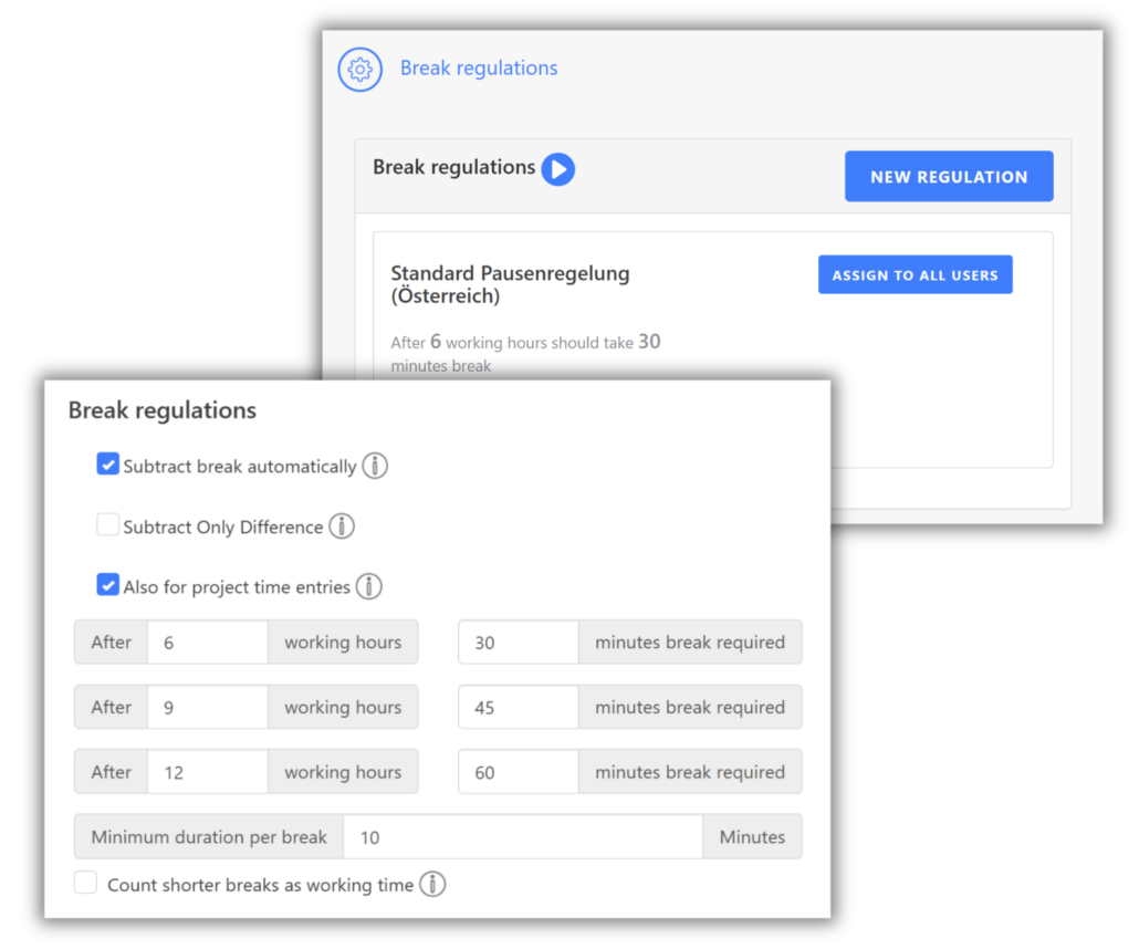 The recording of working hours, including breaks, is legally required. With TimeTrack, you can automatically enforce these break regulations, such as 30 minutes after 6 hours of work or at least 45 minutes after 9 hours of work. The software allows you to use predefined break templates that comply with legal requirements. If your company has its own break policies, you can create custom templates to specify when and how long breaks should last.